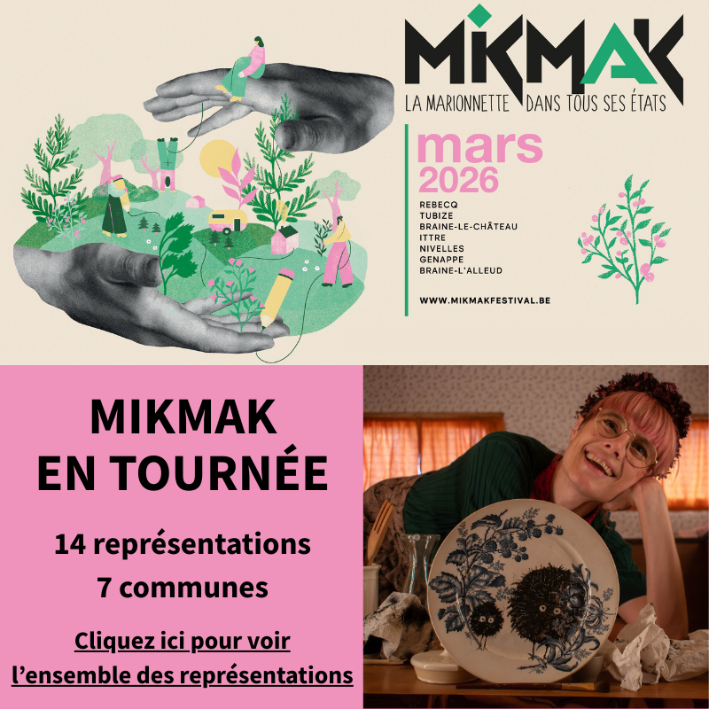 MIKMAK en tournée, c’est un spectacle itinérant qui s’installe dans au cœur des villages de l’Ouest du Brabant wallon, pour aller à la rencontre des gens, faire découvrir la marionnette au plus grand nombre et soutenir un spectacle émergent dans sa diffusion tout public. Cette année, nous vous proposons le spectacle La caravane des Mûchettes de la compagnie Les 2 Frida. Véda vit dans une caravane. Mais elle n’est pas la seule à résider en ces lieux : les mûchettes en sont les vraies propriétaires. Les mûchettes sont de petits êtres qui vivent la nuit et passent leur temps à dessiner. Véda ne se lasse jamais de découvrir jour après jour les nouvelles aventures des mûchettes griffonnées aux quatre coins de la caravane. Et encore moins de raconter leurs histoires à celles et ceux qui y pénètrent.
